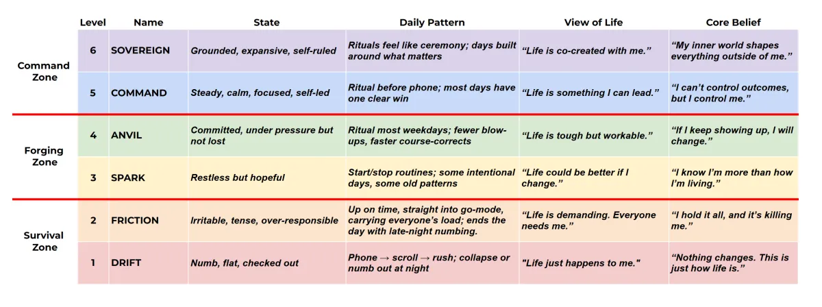 Level 6, SOVEREIGN: Grounded, expansive, self-ruled. Life built around what matters.