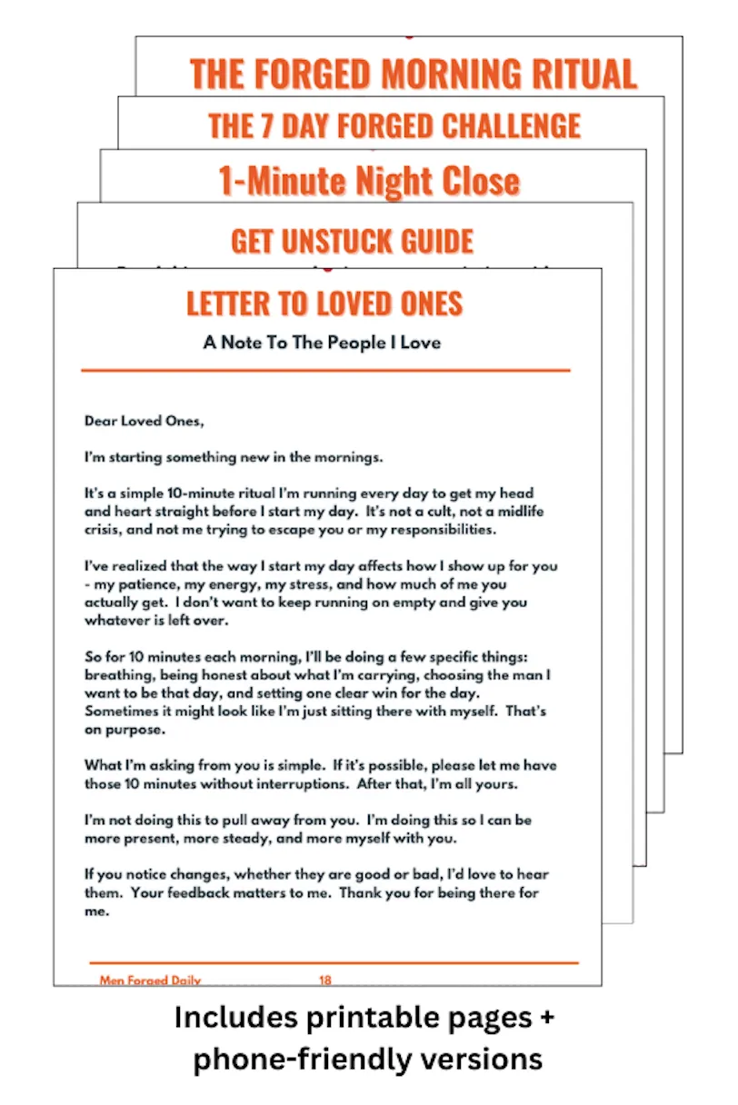 Most routines add tasks to the same burnt out man. FORGED is a guided ritual that stabilizes your nervous system first, then installs a simple standard you can actually keep. Ten minutes. Repeatable.