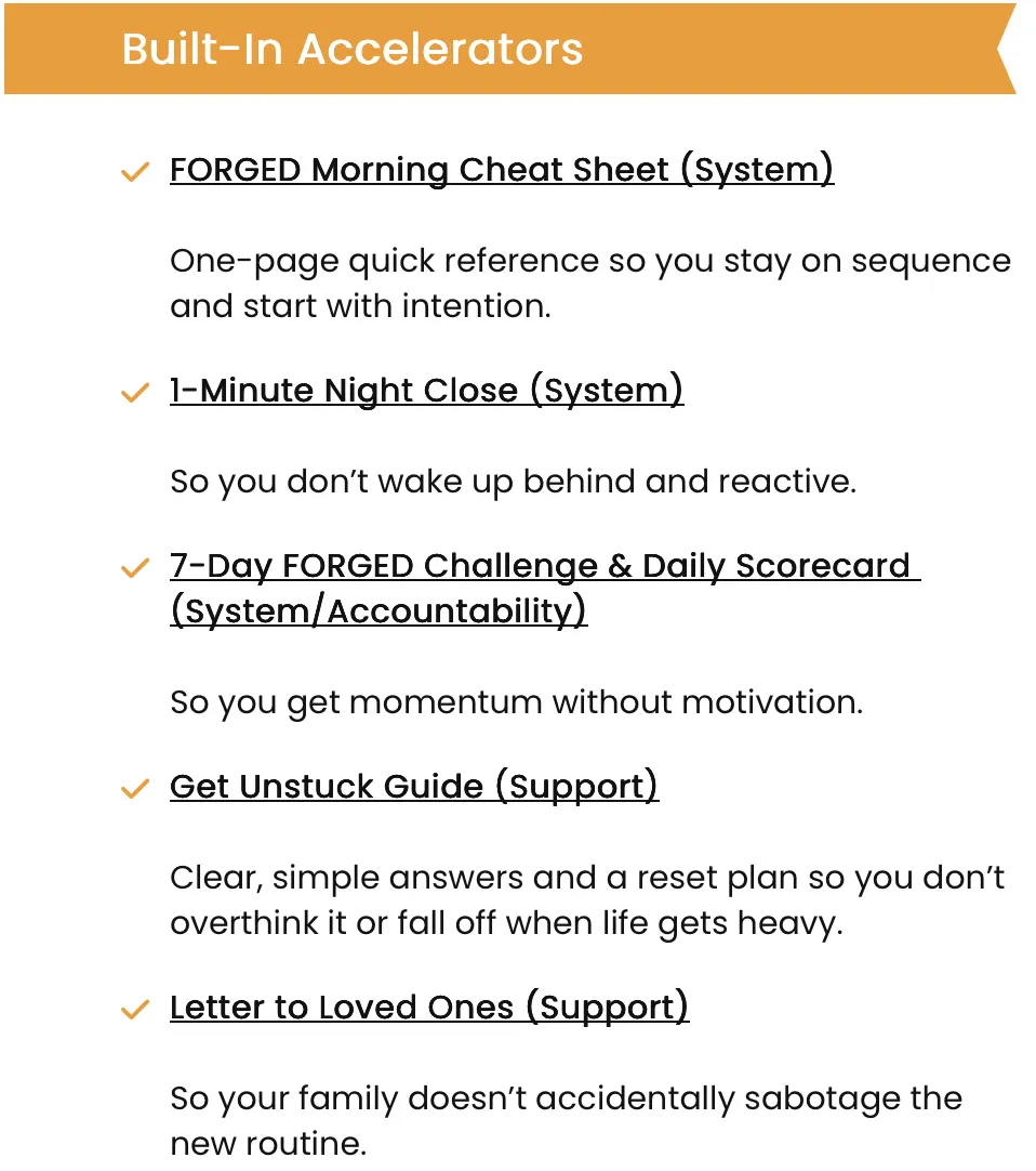 Most routines optimize or add tasks. FORGED changes your baseline (calmer body, clearer mind) so you make better decisions with less effort.